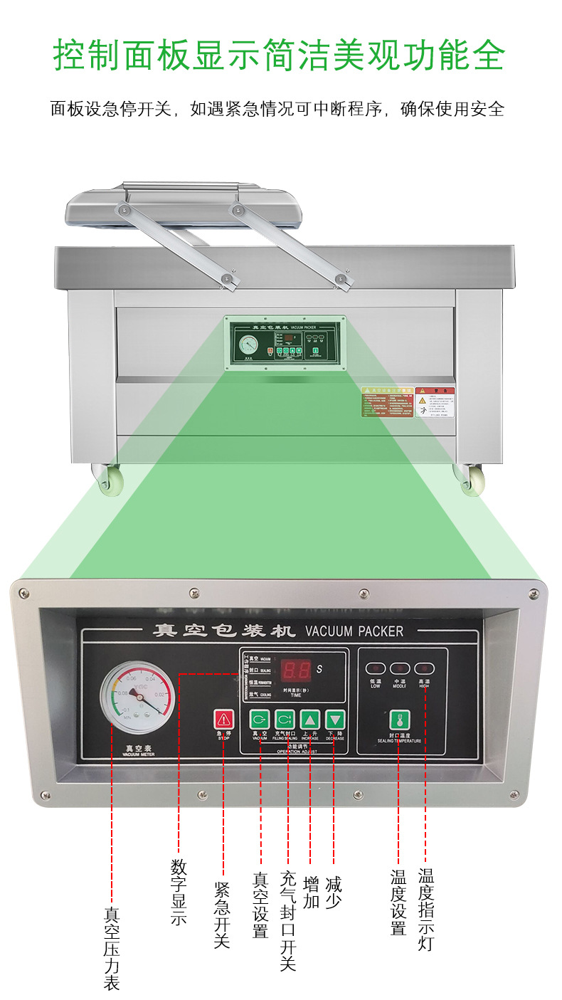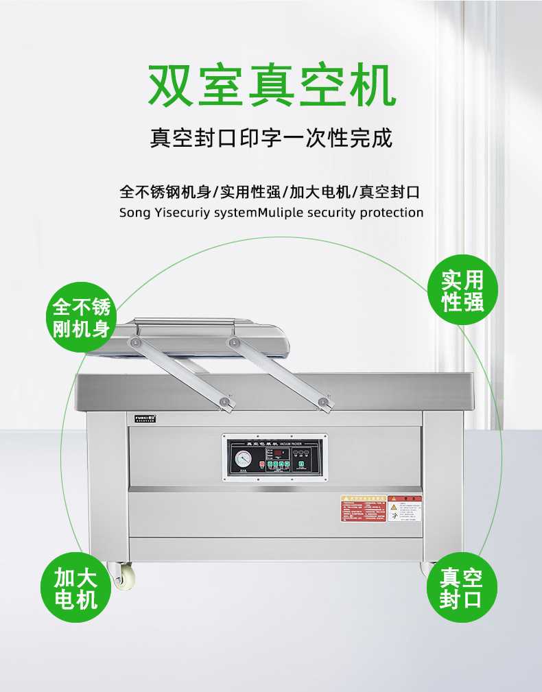 PRODUCT CENTER雙室食品真空包裝機(jī)適用于食品行業(yè)、肉類、四川榨菜、醬制品、調(diào)味品、果脯、糧食、豆制品、化學(xué)品、藥材的顆粒、粉狀、液體等商品進(jìn)行真空包裝,可以防止產(chǎn)品氧化霉變、腐爛、防潮、達(dá)到延長產(chǎn)品的儲存或保鮮期限。雙室食品真空包裝機(jī)適用于食品行業(yè)、肉類、四川榨菜、醬制品、調(diào)味品、果脯、糧食、豆制品、化學(xué)品、藥材的顆粒、粉狀、液體等商品進(jìn)行真空包裝,可以防止產(chǎn)品氧化霉變、腐爛、防潮、達(dá)到延長產(chǎn)品的儲存或保鮮期限。