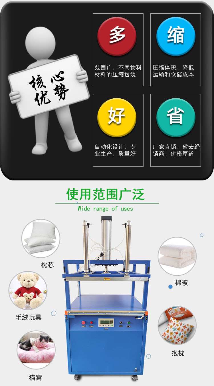 該機器適用于枕頭、棉被、毯子等壓縮包裝,并可防潮、防塵、防蟲。使用該機器,輕松封口,讓您的商品更安全、方便、整潔。